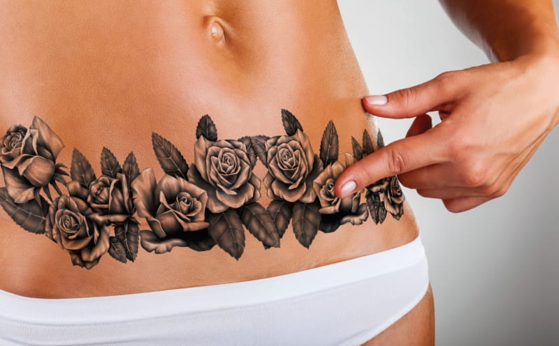 This simple and traditional portrait rose tattoo, designed by Kara Swartz, offers coverage or adornment of tummy or chest scars. Black Baccara coordinates perfectly with our Scarlatta breast tattoo, for those who have multiple scars, such as those from Diep Flap reconstruction surgery.